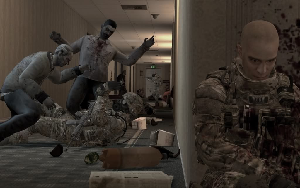In the first screenie it looks like the zombie is stealing the mans sidearm from his holster